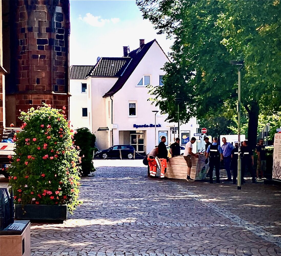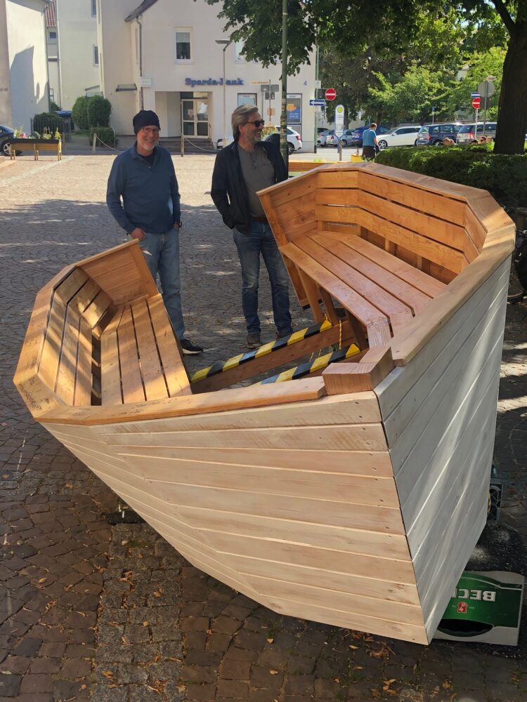 Schließlich trugen wir das Boot in einer bemerkenswerten Aktion zum einladenden und besser sichtbaren westlichen Ende des Platzes. Helfende Hände von Kunst-braucht-Raum, der Ordnungspolizei, dem Bauhof, und Menschen, die einfach zufällig und spontan mitmachten: Gemeinsam waren wir so stark, dass jeder nur seinen kleinen Finger brauchte…