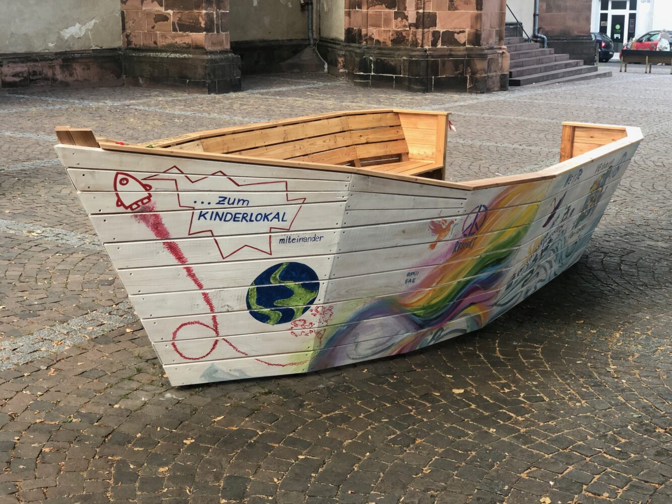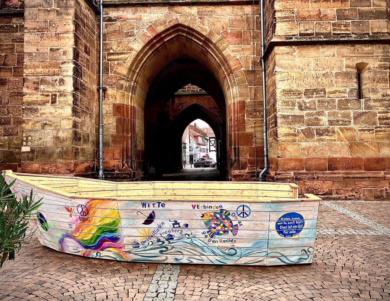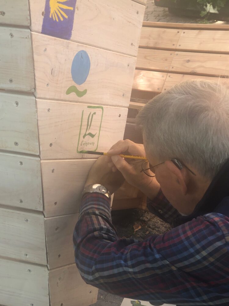 Am 24. August kippten wir das Boot, um die linke Seite zu bemalen. Eine Gruppe junger Frauen aus der Erstaufnahmeeinrichtung in Friedberg malte eine riesige Welle, als führe das Boot durch ein Meer aus Regenbogen. Auch das Kinderlokal, der Umsonstladen vom IZB, Omas gegen Rechts und Rumi Kultur e.V. Bad Nauheim machten mit. Als Gastkünstler malte Erich E. Fechter die Wanderzeichen der vier Pilgerwege, die Friedberg streifen (Der Lutherweg führt über den Stadtkirchenplatz) ans Heck…