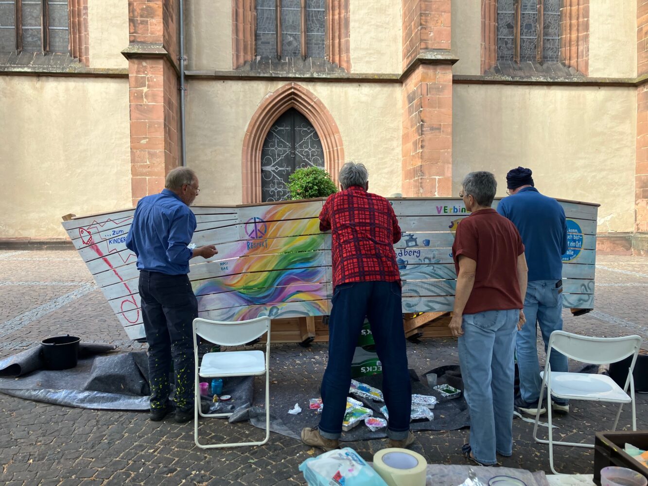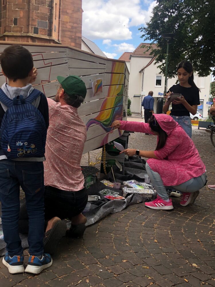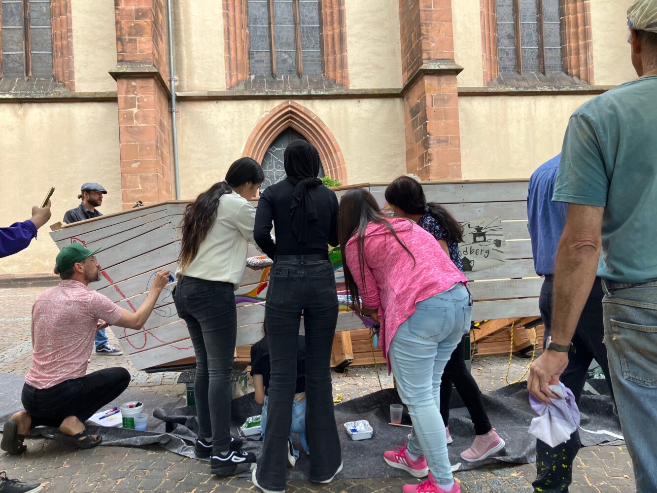 Am 24. August kippten wir das Boot, um die linke Seite zu bemalen. Eine Gruppe junger Frauen aus der Erstaufnahmeeinrichtung in Friedberg malte eine riesige Welle, als führe das Boot durch ein Meer aus Regenbogen. Auch das Kinderlokal, der Umsonstladen vom IZB, Omas gegen Rechts und Rumi Kultur e.V. Bad Nauheim machten mit. Als Gastkünstler malte Erich E. Fechter die Wanderzeichen der vier Pilgerwege, die Friedberg streifen (Der Lutherweg führt über den Stadtkirchenplatz) ans Heck…