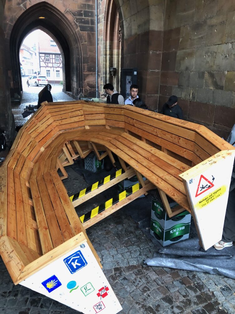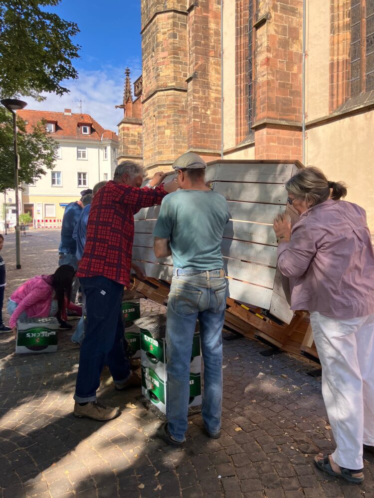 Ebenso beteiligte sich die Integrationsklasse der JPR-Schule sowie junge Teilnehmende der IB-Druckwerkstatt und Mitglieder des IZF. Als der Regen zu stark wurde, trugen wir alle gemeinsam das Boot unter den Bogen der Stadtkirche. Mit großer Begeisterung malten alle bis in die Dunkelheit hinein – Stück für Stück, Farbe für Farbe, Idee für Idee, einer spendet Licht mit seinem Handy.